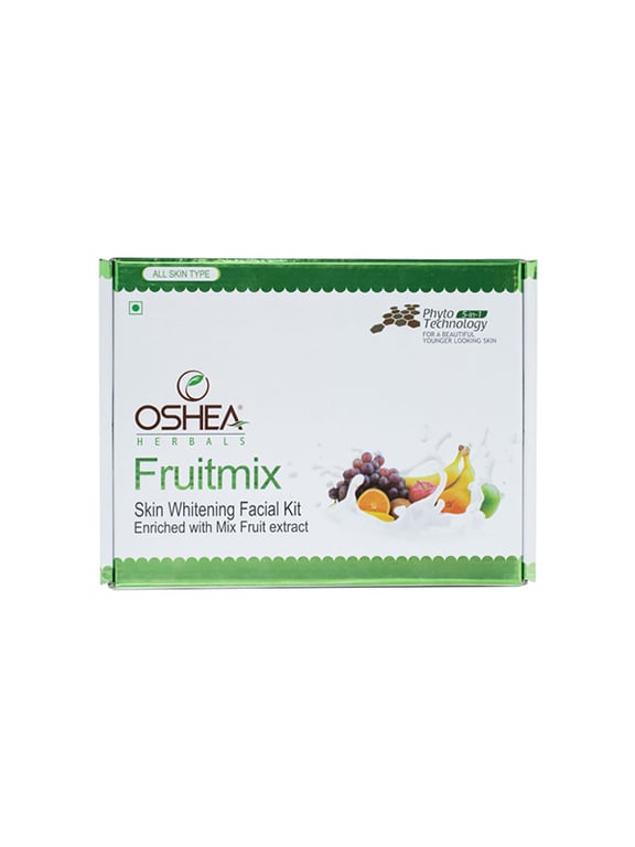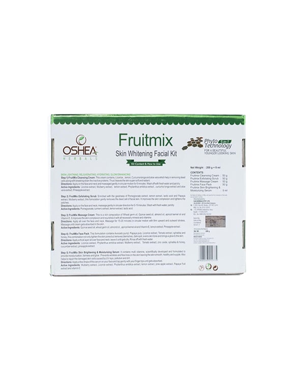 Oshea Herbals Fruitmix Skin Whitening Facial Kit provides a 5 step Phyto tech regimen enriched with fruit extracts, delivers deep hydration rejuvenation and visible whitening for a brighter smoother and younger looking complexion for all skin types