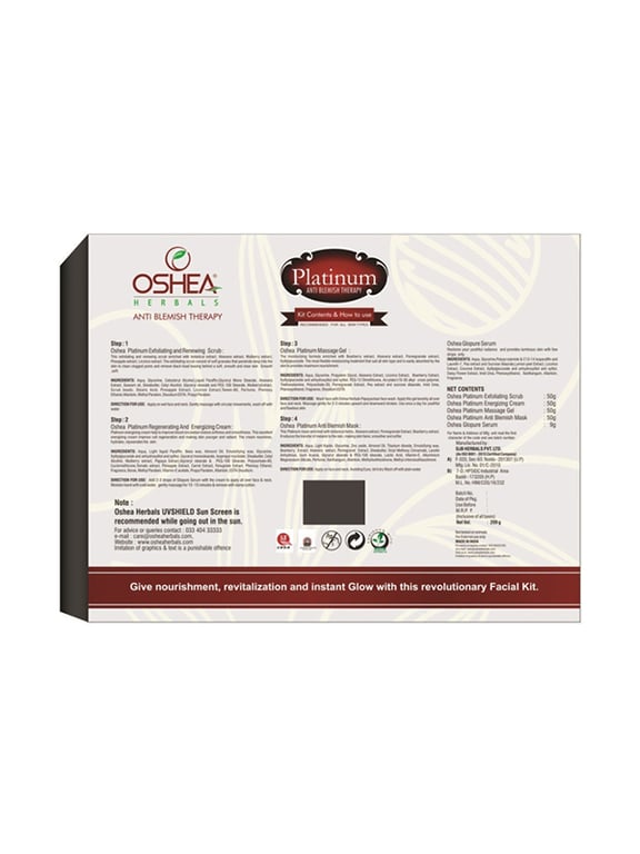 The Oshea Herbals Platinum Anti-Blemish Therapy Facial Kit is a comprehensive, multi-step skincare solution designed to target blemishes, dark spots, and uneven skin tone, while imparting a luxurious, radiant glow.